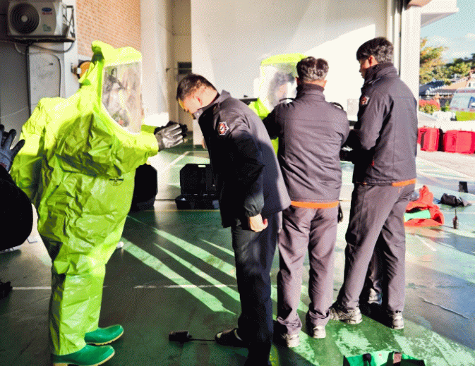 이어서 보건소 초동대응요원을 대상으로 개인 보호복(Level A)의 착·탈의 방법과 공기호흡기 사용법 등 실습 교육을 실시해 현장대응능력을 강화했다.