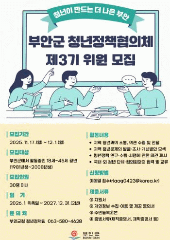 모집대상은 부안군에서 거주하거나 활동하는 18세~45세 청년으로, 청년정책에 관심이 있거나 활동의지가 있는 누구나 지원할 수 있다.
