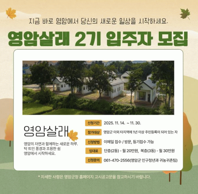 신청은 영암군 인구청년과 귀농귀촌팀에서 이메일 등으로 받고, 방문·등기 접수는 이달 28일까지 마감이다.
