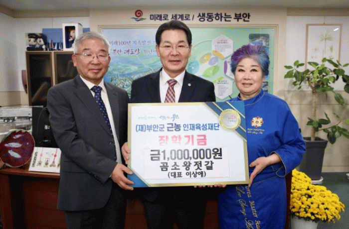 권익현 부안군 근농인재육성재단 이사장은 “지역사회에 관심과 따뜻한 마음을 전해주신 곰소왕젓갈 이상애 대표께 감사드린다”라며 “소중한 장학금은 투명하게 사용해 지역의 미래 인재를 키우는 데 최선을 다하겠다”라고 감사를 전했다.