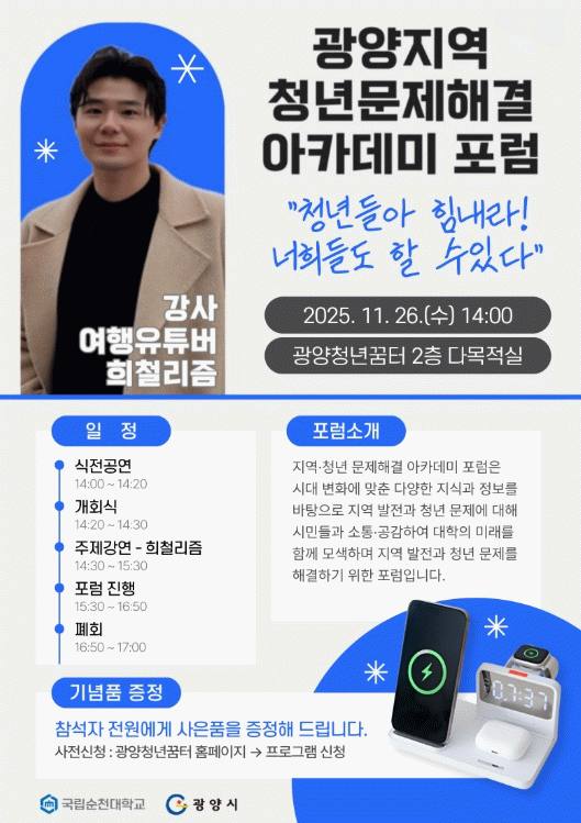 이번 포럼은 광양시민 누구나 참여할 수 있으며, 광양청년꿈터 누리집(홈페이지) ‘꿈터 프로그램’에서 11월 25일까지 신청 가능하다.