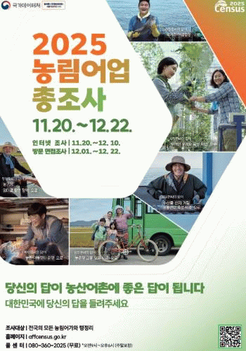 한편, 농림어업총조사 실시와 관련해 궁금한 사항은 정읍시 통계조사 종합상황실(☎063-539-6971~80)로 문의하면 자세한 안내를 받을 수 있다.