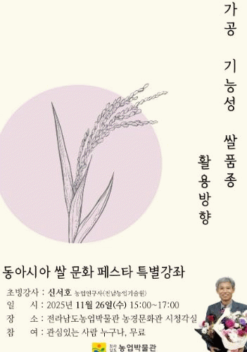 김옥경 전남도농업박물관장은 “이번 강좌는 쌀 품종 육성과 가공산업, 현장 융합모델 등 미래농업 발전 방향을 모색하는 소중한 시간이 될 것”이라며 “많은 도민과 농업 종사자, 관람객의 적극적인 참여 바란다”고 당부했다.