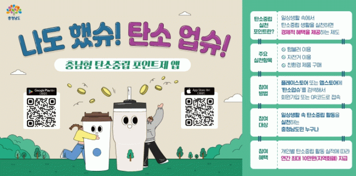 이 프로그램은 일상생활에서의 탄소중립활동을 장려하도록 충남도에서 추진하고 있으며 애플리케이션으로 항목별 탄소생활 실천 시 포인트를 지급한다.