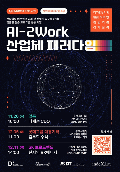 오는 11월 26일부터 시작되는 이번 프로그램은 전남대학교 디자인학과가 주최·주관하고 아트·디자인테크놀로지 협동과정이 공동주관한다.