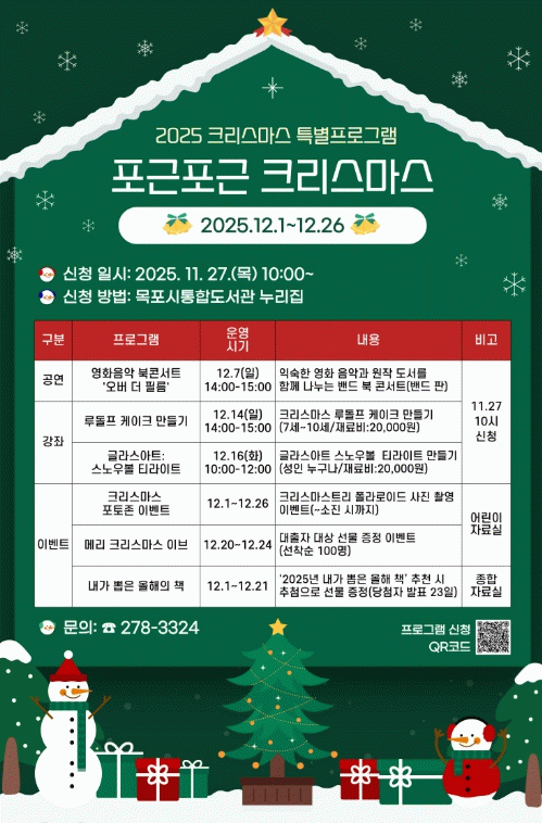 프로그램 신청은 11월 27일 오전 10시부터 목포시통합도서관 누리집에서 가능하며, 자세한 내용은 누리집 공지사항을 확인하거나 목포시립도서관으로 문의하면 된다.