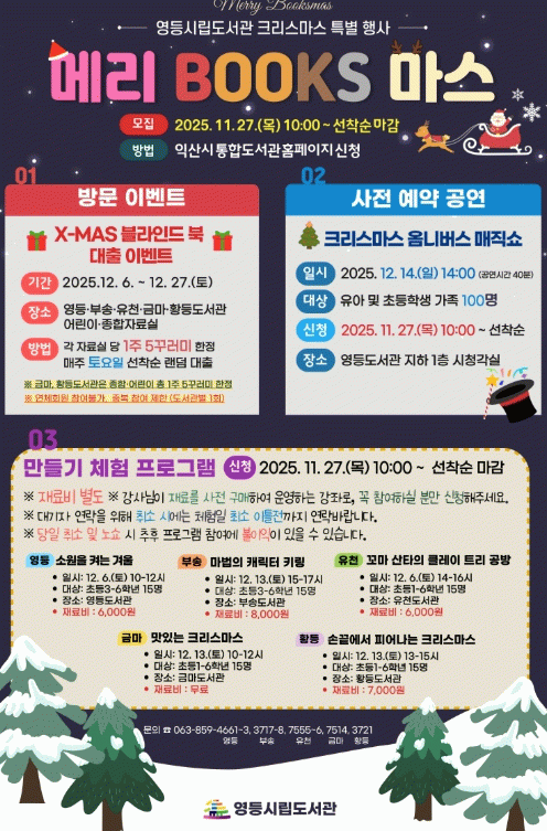 익산시는 '메리 북스(BOOKS) 마스'를 주제로 12월 영등·부송·유천·금마·황등 5개 시립도서관에서 다채로운 독서문화 행사를 운영한다.