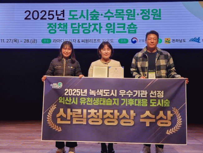 익산시는 산림청 주관 '2025년 녹색도시 우수사례-기후대응도시숲 분야'에서 유천생태습지 기후대응도시숲의 우수성을 인정받아 산림청장상을 받았다.