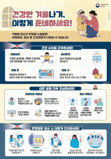 어린이와 어르신은 일반 성인에 비해 체온유지에 취약하며, 심뇌혈관·당뇨병·고혈압 등 만성질환자는 급격한 온도 변화에 따라 혈압이 급격히 상승하는 등 증상이 악화할 수 있어 각별한 주의가 필요하다.