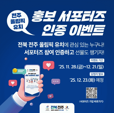 도는 국민과 함께 만들어가는 전주 올림픽 유치를 목표로 지난 8월부터 홍보 서포터즈를 모집·운영 중이다. 약 1,900명이 참여하고 있는 서포터즈는 개인 SNS 등 온라인 채널을 통해 전주 올림픽 유치 소식을 자유롭게 공유하며, 올림픽 개최의 필요성과 의미를 국민에게 널리 전파하는 역할을 담당하고 있다.