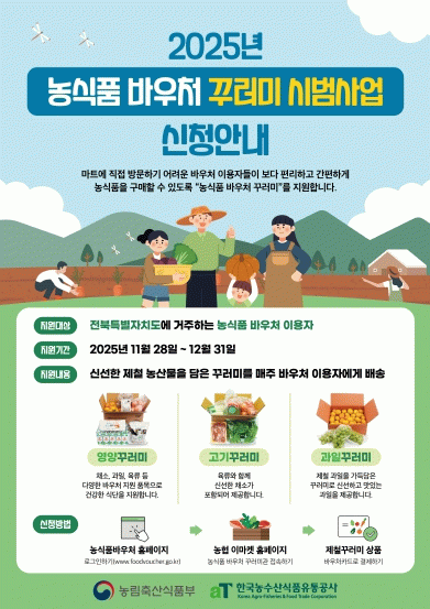 사업 기간은 2025년 11월 28일부터 12월 31일까지이며, 이 기간 동안 농식품 바우처 이용자는 제철 농산물 꾸러미를 정기적으로 받을 수 있다. 특히 마트 방문이 어려운 고령자나 도서·산간 지역 거주자 등 기존 사용처 접근이 쉽지 않았던 이용자도 지역 농산물로 구성된 다양한 꾸러미 상품을 집에서 편리하게 받아볼 수 있게 된다.