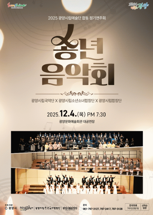 정인화 광양시장은 “이번 송년 음악회는 2025년 한 해 동안 시민과 함께해온 시립예술단의 여정을 마무리하는 뜻깊은 자리이자, 새해를 향한 희망을 함께 나누는 시간”이라며 “많은 시민들이 따뜻한 음악 속에서 한 해를 아름답게 마무리하길 바란다”고 말했다.