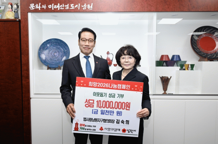 최경식 남원시장은 “매년 잊지 않고 따뜻한 마음을 전해주시는 김숙희 회장님께 깊이 감사드린다”라며, “희망2026 나눔 캠페인의 첫 기부로 더 큰 의미를 더해주신 만큼, 성금은 학생들이 밝은 미래를 향해 나아갈 수 있도록 소중히 사용하겠다”라고 전했다.
