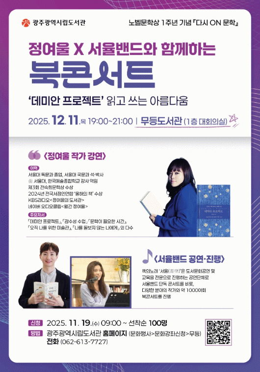 송경희 시립도서관장은 “한강 작가의 노벨문학상 수상 1주년을 기념해 마련한 이번 행사가 문학과 예술의 소중함을 알리고, 지역 시민들에게 풍요로운 문화 경험을 제공하기를 기대한다”고 밝혔다.