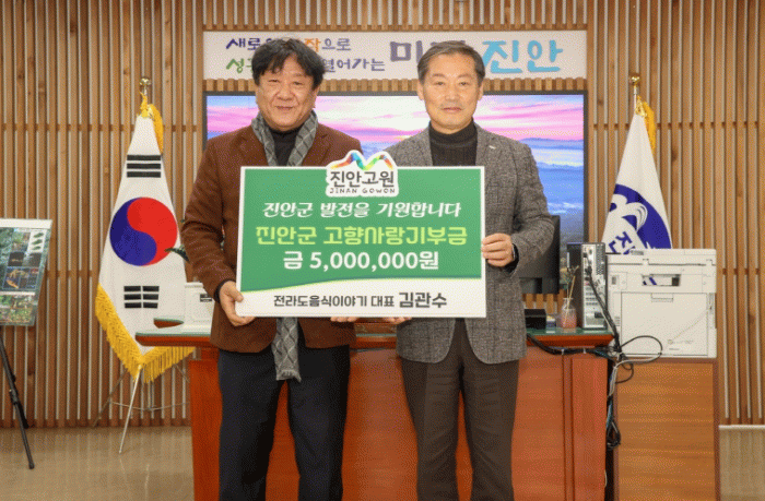 전춘성 진안군수는 “꾸준히 고향을 위해 따뜻한 마음을 전해주시는 김관수 대표님께 깊은 감사의 뜻을 전한다”며, “기탁해주신 소중한 기부금은 진안군민의 복리 증진과 지역 발전을 위해 소중히 사용하겠다”고 전했다.