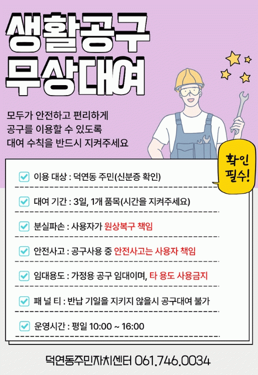 공구 대여 희망자는 신분증을 지참해 덕연동 행정복지센터 2층 주민자치센터를 방문해 1인 1개 품목을 최대 3일간 대여할 수 있다.