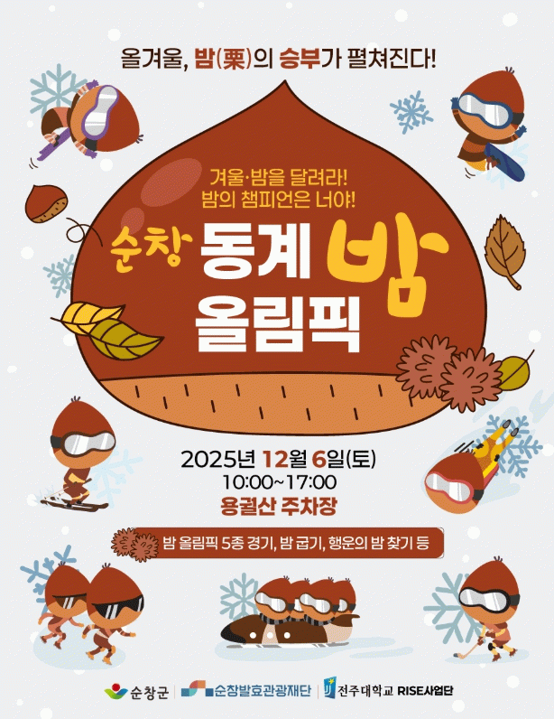 ‘동계 밤 올림픽’에서는 순창 동계 지역의 특산물인 밤을 활용한 ▲밤 컬링 ▲밤 볼링 ▲밤 굴리기(밤 골프) ▲밤 다트 ▲동계 밤 부루마블 등 5종 밤 경기와 시상식이 주요 프로그램으로 진행된다.
