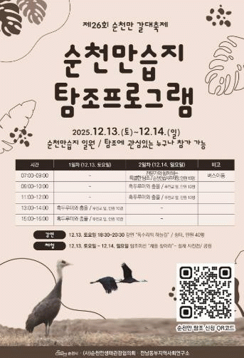 특히 겨울의 순천만에는 현재 흑두루미 약 8,600마리를 비롯해 멸종위기종인 독수리, 노랑부리저어새 등 희귀 철새가 대거 도래하고 있어, 이번 축제는 국내 최대 규모의 겨울철새 서식지를 현장에서 체험할 수 있는 특별한 기회가 될 전망이다.