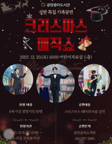 김현숙 도서관과장은 “아이들이 이번 공연을 통해 새로운 상상과 창의의 세계를 경험하고 마술의 원리를 탐구하는 재미를 느끼길 기대한다”며 “도서관을 찾은 가족 모두가 함께 웃고 공감하며 따뜻한 성탄의 추억을 만들어 가길 바란다”고 말했다.