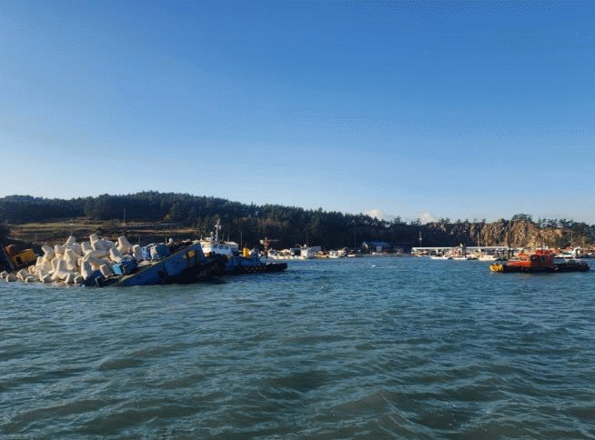 현재 바지선은 수심이 얕은 구역으로 이동 조치되어 추가 침수나 전복 위험은 없는 상태다.