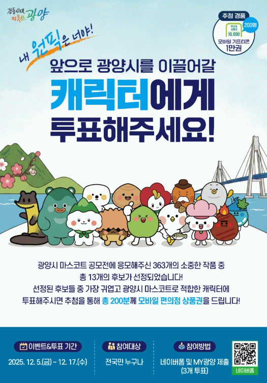시는 이번 선호도 투표를 광양시의 미래를 함께 만들어가는 중요한 과정으로 보고, 적극적인 참여를 유도하기 위해 투표 참여자 중 총 200명을 추첨해 1만 원 상당의 모바일 편의점 상품권을 제공할 예정이다.