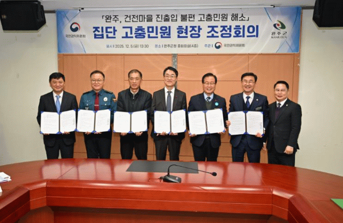 이날 협약식에는 유의식 의장, 성중기 위원장, 유희태 완주군수, 한삼석 국민권익위원회 부위원장, 조현익 전주국토관리사무소장, 박종호 완주경찰서장, 이호선 건전마을 주민(신청인) 등 20여 명이 참석했다.