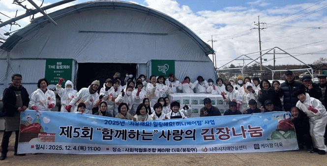 강용곤 나주시 보건소장은 “지역사회가 함께한 김장이 치매 취약계층에게 힘이 되길 바란다”며 “앞으로도 어르신과 주민이 함께할 수 있는 참여형 프로그램을 확대해 더 질 높은 서비스를 제공하겠다”고 말했다.