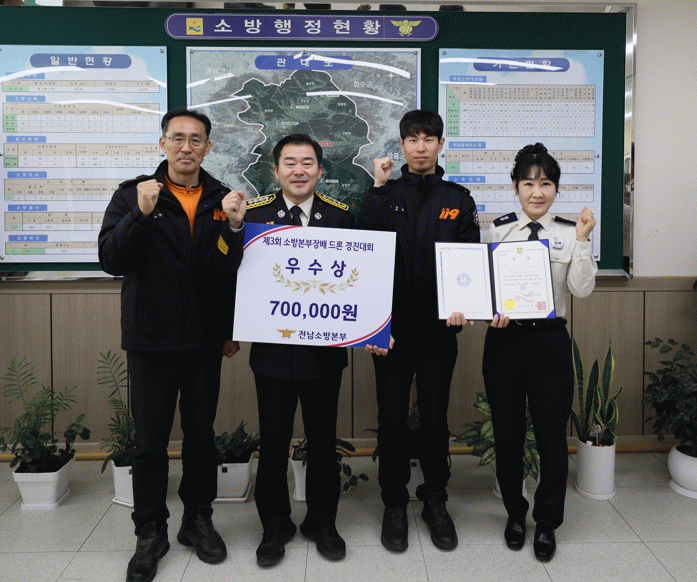 특히 재난 현장 투입을 가정한 조종 안정성, 다중 임무 수행능력, 장애물 회피 및 신속 탐색 과제에서 고른 성적을 거두며 전남 소방드론 운용역량 향상에 기여한 점을 인정받아 우수상이라는 영예를 안았다.