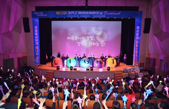 행사는 ‘자원봉사의 불빛, 강진을 밝히는 힘!’이라는 슬로건 아래 진행됐다. 관객석 뒤편에서 자원봉사의 불빛을 상징하는 ‘LIGHT’ 공 5개가 봉사자의 손길을 따라 무대 위로 전달되는 퍼포먼스가 펼쳐졌다. 이 퍼포먼스는 자원봉사자의 나눔의 손길과 그들의 빛나는 헌신을 의미하는 상징적인 장면이었다.