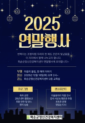 박미라 화순군보건소장은 “이번 연말 행사를 통해 정신장애인 및 가족의 사회적 고립감이 완화되는 계기가 되기를 바라고, 지난 한 해를 돌아보며 서로를 격려하고, 2026년을 행복하게 맞이할 수 있기를 바란다”라고 전했다.