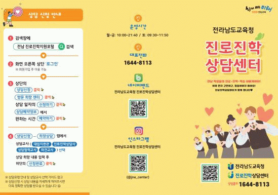 상담은 진로진학지원포털을 통해 예약할 수 있으며, 순천·목포·여수·나주·광양센터에서 대면 상담으로 진행된다.