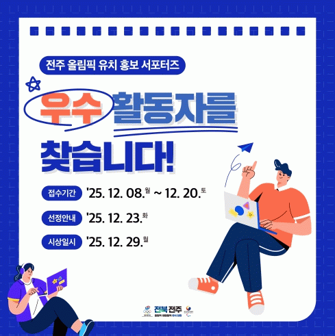 이번 우수 활동자 선발은 서포터즈들의 자발적이고 창의적인 홍보 활동을 장려하고, 향후 전주 올림픽 유치에 대한 관심과 참여를 확산하기 위해 마련됐다.