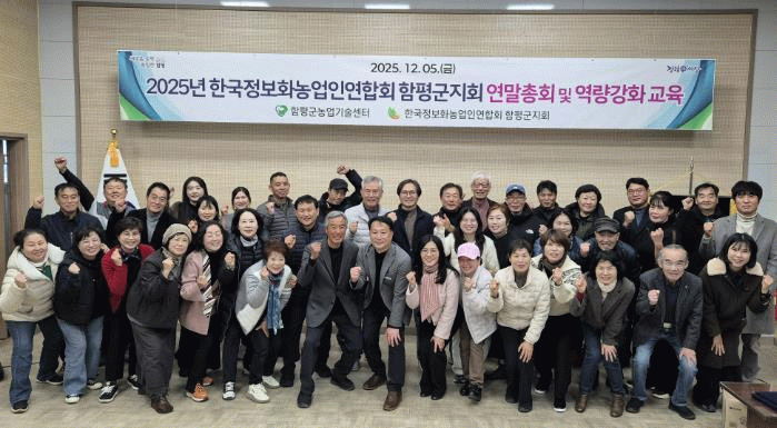 함평군은 9일 “한국정보화농업인연합회 함평군지회(이하 한정농)가 지난 5일 함평군농업기술센터 플라워푸드다목적홀에서 회원 50여 명이 참석한 가운데 ‘2025년 연말총회’를 성황리에 개최했다”고 밝혔다.