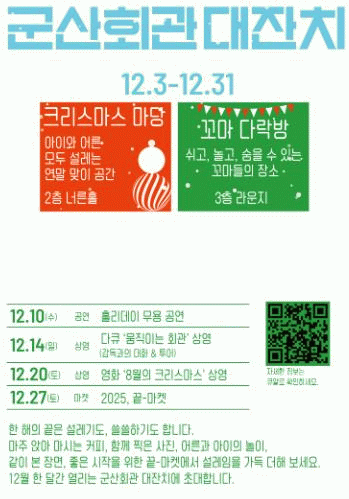 10일에 열리는 ‘홀리데이 무용’은 군산시 어린이 무용단이 꾸미는 크리스마스와 연말 축하 공연으로 소고춤·교방무·K-pop 댄스·크리스마스 캐럴 춤 등 시간과 공간을 초월하는 세계 각국의 무용으로 관람객들을 즐겁게 할 예정이다.