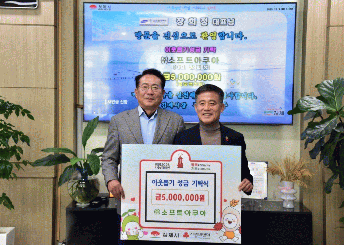 정성주 김제시장은 “기업이 앞장서 나눔을 실천해 주시는 것만으로도 지역사회에 큰 힘이 된다”며 “전달해주신 성금은 도움이 필요한 가정에 전달해 따뜻하고 튼튼한 복지 기반을 만드는 데 소중히 활용하겠다“고 전했다.