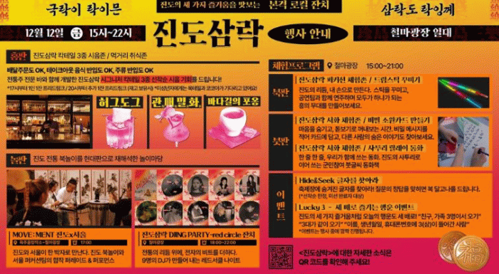 이 밖에도 진도의 삼락(三樂)처럼 즐거움을 세배로 더하는 ▲럭키 3 이벤트 ▲숨은 글자 찾기 등 다양한 부대행사가 마련돼 축제의 재미를 더할 전망이다.