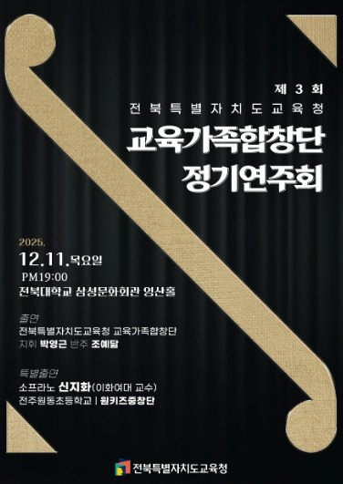 유정기 교육감 권한대행은 “이번 교육가족합창단 정기연주회를 통해 전북 교육가족이 서로의 목소리를 맞추며 하나 되는 감동의 무대가 될 것”이라며 “노래로 마음을 잇는 교육공동체의 아름다운 하모니가 전북 예술교육의 새로운 울림으로 확산되길 기대한다”고 말했다.