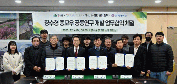 이번 협약은 협약기관 간 상호 업무협조 체계를 구축해 장수 한우 산업의 경쟁력을 높이기 위한 장수 지역 사양환경에 적합한 우수 유전자원을 확보하고, 탄소배출을 줄이면서도 생산성과 품질을 높일 수 있는 종모우 개발을 위해 마련됐다.