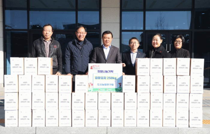 시는 12일 도시농업연구회가 직접 재배한 배추와 무로 담근 김치 5kg 50상자(190만원 상당)를 기탁하며 온정을 나눴다고 밝혔다.