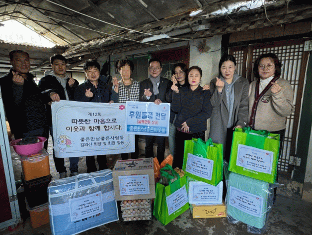 함평군은 12일 “좋은만남좋은사람들(회장 김의신)이 지난 5일 함평읍·학교면·엄다면 등 3개 읍면의 어려운 이웃들이 보다 따뜻한 겨울을 보낼 수 있도록 이불과 식료품 등 150만 원 상당의 물품을 전달했다”고 밝혔다.