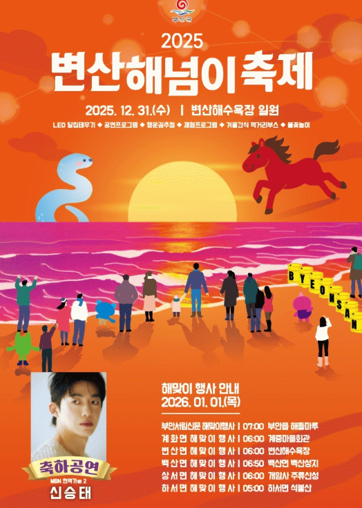 권익현 부안군수는 “2025 변산 해넘이축제는 한 해의 끝자락에서 서로의 안녕과 희망을 나누는 따뜻한 자리”라며 “변산의 아름다운 자연과 함께 군민과 관광객 모두가 기억에 남을 연말을 보내시길 바란다”고 말했다.