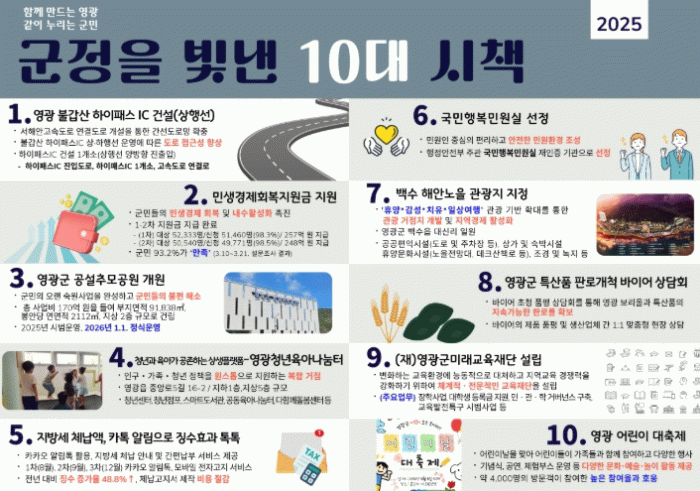 이번 10대 우수시책 중‘영광 불갑산 하이패스 IC 건설(상행선)’이 최고 점수를 받으며, 지역 교통 인프라 강화와 군민 이동 편의 증진에서 큰 성과를 거둔 것으로 평가됐다.