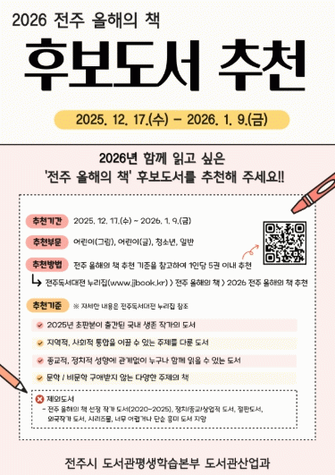 시는 내년 1월 9일까지 ‘2026 전주 올해의 책’ 후보도서 시민 추천을 접수한다고 19일 밝혔다.