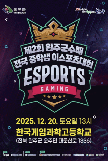 완주군은 오는 12월 20일, 한국게임과학고등학교에서 '제2회 완주군수배 전국 중학생 e스포츠대회'를 개최한다고 밝혔다.
