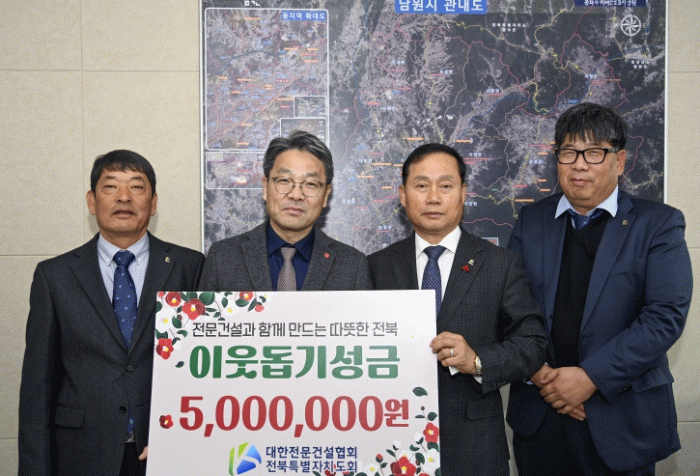이성호 남원시 부시장은 “매년 잊지 않고 따뜻한 나눔을 실천해 주시는 대한전문건설협회 관계자분들께 감사드린다”라며, “기부해 주신 성금은 도움이 절실한 분들께 잘 전달해 따뜻한 겨울을 보낼 수 있게 하겠다”라고 화답했다.