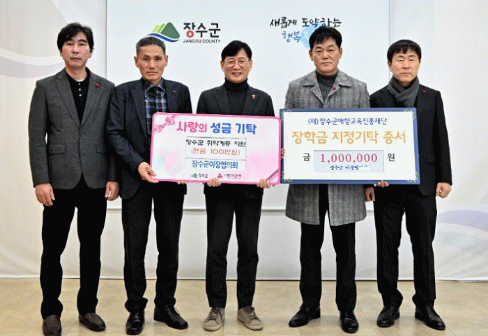 한편 장수군 이장협의회는 연말연시마다 장학금과 이웃돕기 성금 기탁을 지속해오고 있으며, 이번에 전달된 장학금은 학생들의 학업 지원에, 이웃돕기 성금은 관내 취약계층을 위한 복지사업에 활용될 예정이다.