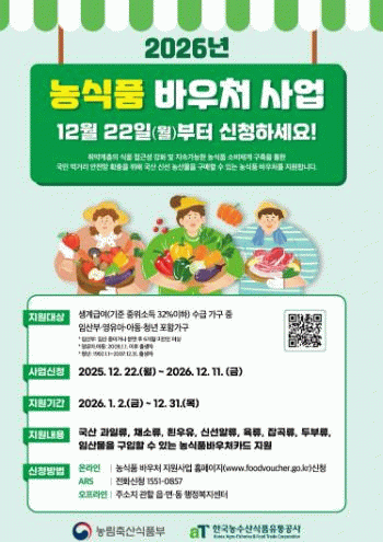 농식품 바우처지원사업은 저소득 취약계층의 식품 접근성을 높이고 국산 농산물 소비를 촉진하기 위한 사업으로 지원 대상은 임산부‧영유아‧아동이 포함된 생계급여 수급 가구로 지원금액은 1인 가구 월 4만 원, 4인 가구 월 10만 원 등 가구원 수에 따라 차등 지급되며, 1월부터 12월까지 12개월간 지원된다.