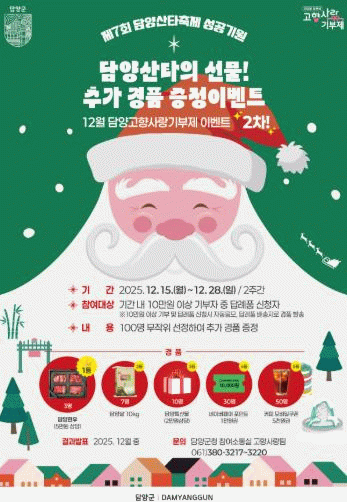 먼저 오는 28일까지 10만 원 이상 기부자 중 100명을 무작위 추첨해 담양한우, 쌀 등 지역 특산품을 증정하는 ‘담양산타의 선물 이벤트’가 진행된다.