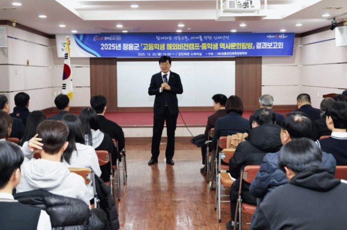 보고회는 한국농어촌공사 장흥지사의 인재육성 장학금 기탁을 시작으로, 중학생 해외문화탐방 결과 발표와 고등학생 해외비전캠프 성과 보고, 학생 소감 발표가 이어졌다.