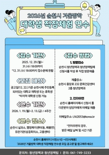 선발된 연수생은 2026년 1월 19일부터 2월 13일까지 4주간 순천시청 및 행정복지센터와 유관기관에 배치되어 하루 5시간씩 근무하며, 행정업무를 보조하고 공공부문 업무 전반을 직접 체험하게 된다.